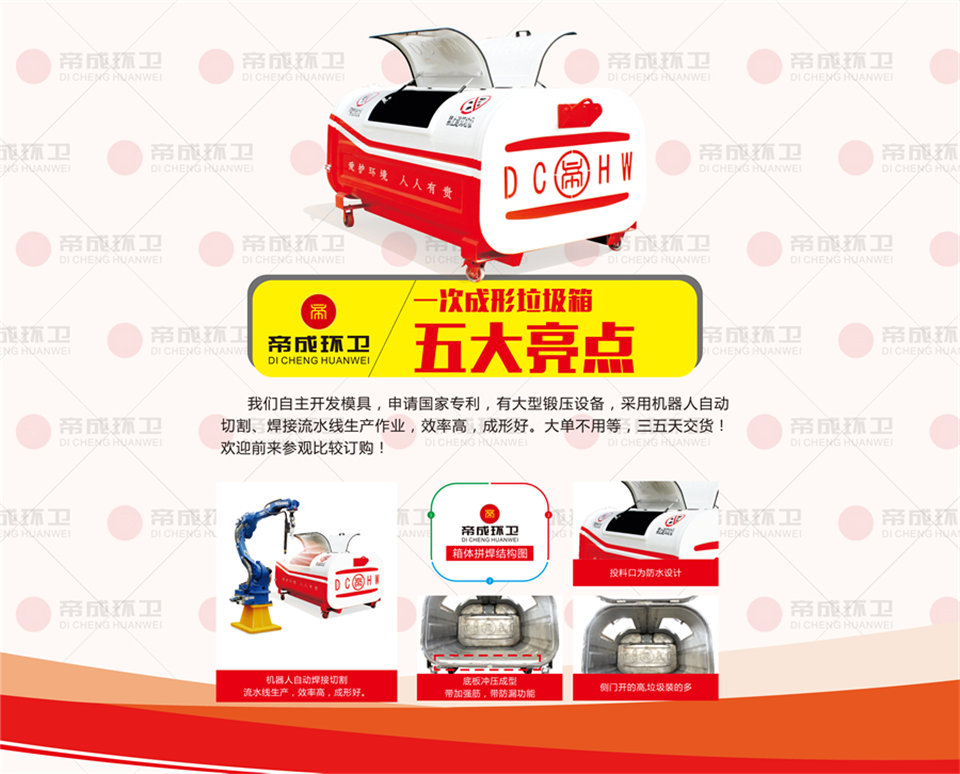 1.一次成型垃圾箱是我公司自主開發(fā)模具,申請**,我們有大型鍛壓設備,采用機器人自動切割,焊接流水線生產(chǎn)作業(yè), 效率高,成型好。